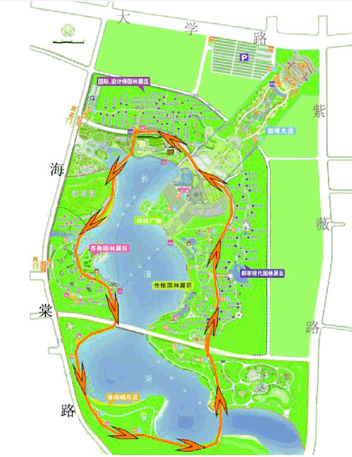 本次大賽舉辦地濟(jì)南國(guó)際園博園是目前國(guó)內(nèi)陸地面積最大的園博園。園內(nèi)展園總數(shù)超過一百個(gè),包括17個(gè)省內(nèi)城市、45個(gè)其他城市、我國(guó)港澳臺(tái)地區(qū)以及21個(gè)國(guó)外城市的主題園區(qū)。大賽分為專業(yè)組和業(yè)余組,專業(yè)組男、女各取前十名進(jìn)行獎(jiǎng)勵(lì),業(yè)余組男、女各取前20名進(jìn)行獎(jiǎng)勵(lì)。參賽者們將在園博園環(huán)繞長(zhǎng)清湖奔跑,專業(yè)組15公里,業(yè)余組7.5公里。